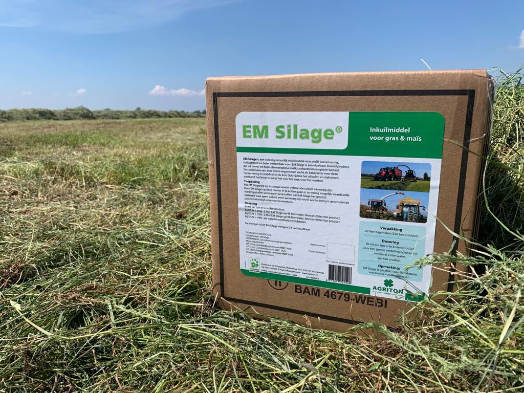 Een goede ruwvoerkwaliteit is voor veehouders een must en uitdaging tegelijk. EM Silage® maakt deze uitdaging realiseerbaar. Het voorkomt in- en uitkuilverlies en is een besparing op extra aanvoer van ruwvoer. EM Silage® is een vloeibaar, levend product, dat uit melkzuurbacteriën en gisten bestaat, die zorgen voor een snelle aanvangswerking en conservering. De combinatie van deze micro-organismen werkt als katalysator voor deze conservering en stabiliteit in de kuil. Ook tijdens het uitkuilen en stalvoeren voorkomt het broei en zorgt het voor fris voer, voor het voerhek.