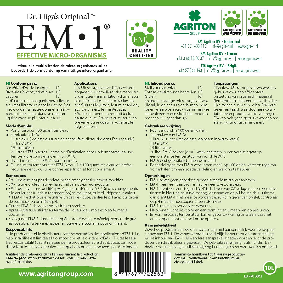 EM·1® is een mengsel van vrij in de natuur voorkomende Effectieve Micro-organismen (EM®) en wordt gebruikt om de natuurlijke weerstand van bodem, plant, water, mens & dier te verhogen. EM·1® bevat verschillende soorten effectieve micro-organismen. Ieder van deze Effectieve Micro-organismen heeft specifieke taken. De micro-organismen bevorderen bovendien elkaars werking.
